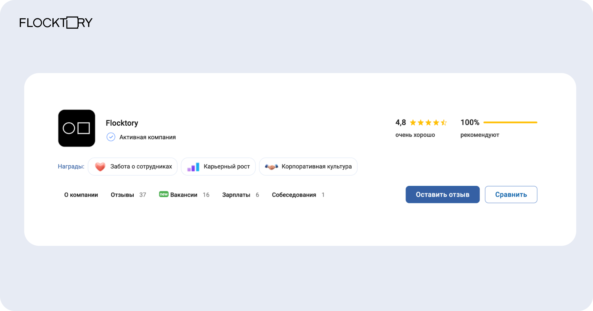 Сейчас у Flocktory 37 отзывов со средней оценкой 4,8 из 5. В 2024 году мы каждый квартал поддерживали статус открытого работодателя и получили три награды DreamJob из трех возможных: