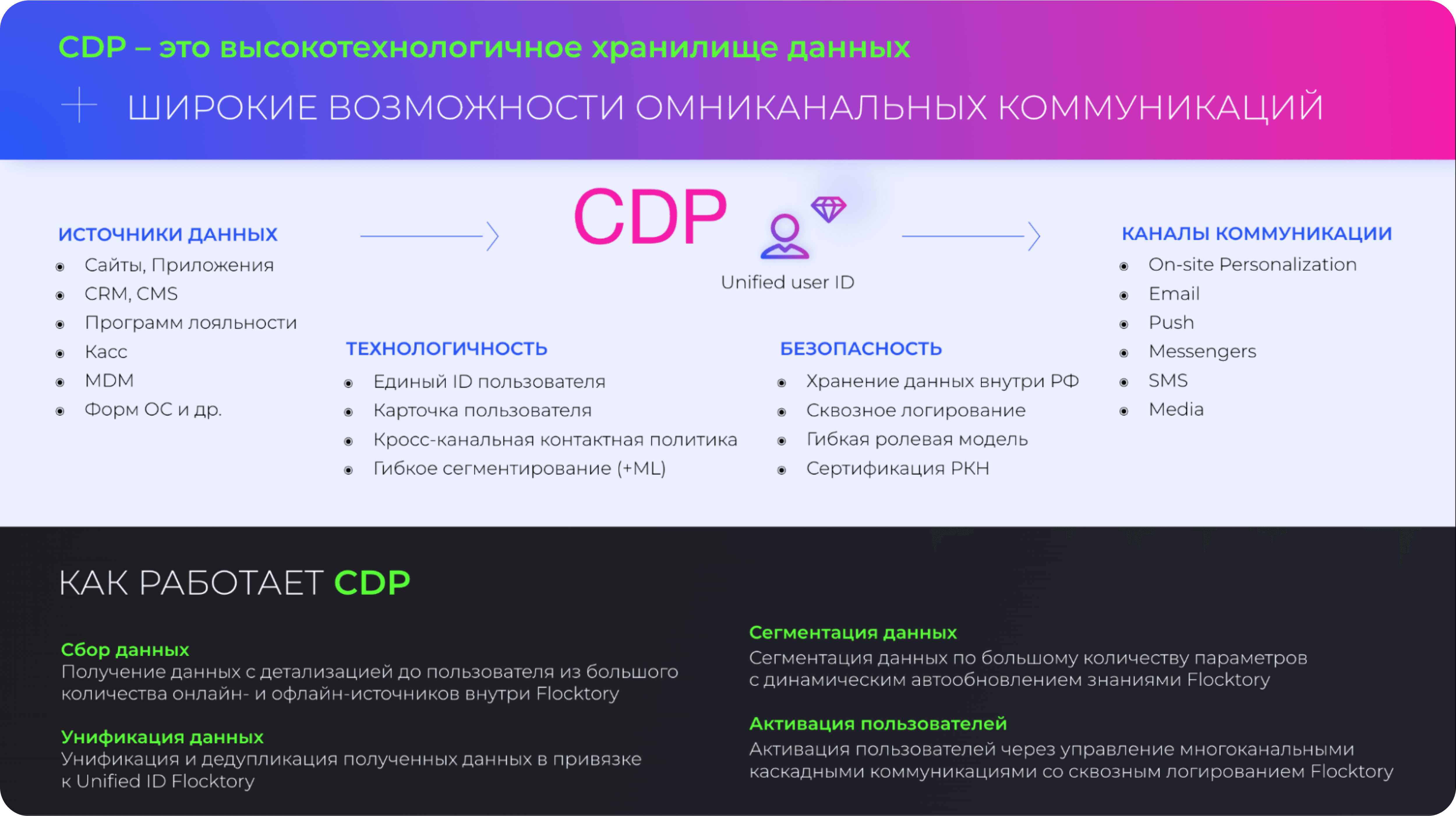 Чтобы наладить работу в омниканальном формате, важно комплексно подходить к вопросу. Выстройте систему управления контентом, которая будет собирать данные из всех каналов и формировать обобщенный портрет клиента. Так вы сможете получить целостное представление о каждом пользователе и его привычках. Настройте работу через все каналы, чтобы клиенты всегда были в курсе новостей, имели доступ к историям покупок вне зависимости от того, через какой канал взаимодействуют с компанией. Подключите CDP (платформу клиентских данных) и собирайте внутри нее все данные о пользователе и его поведении. В дальнейшем их можно применять во всех каналах коммуникации.