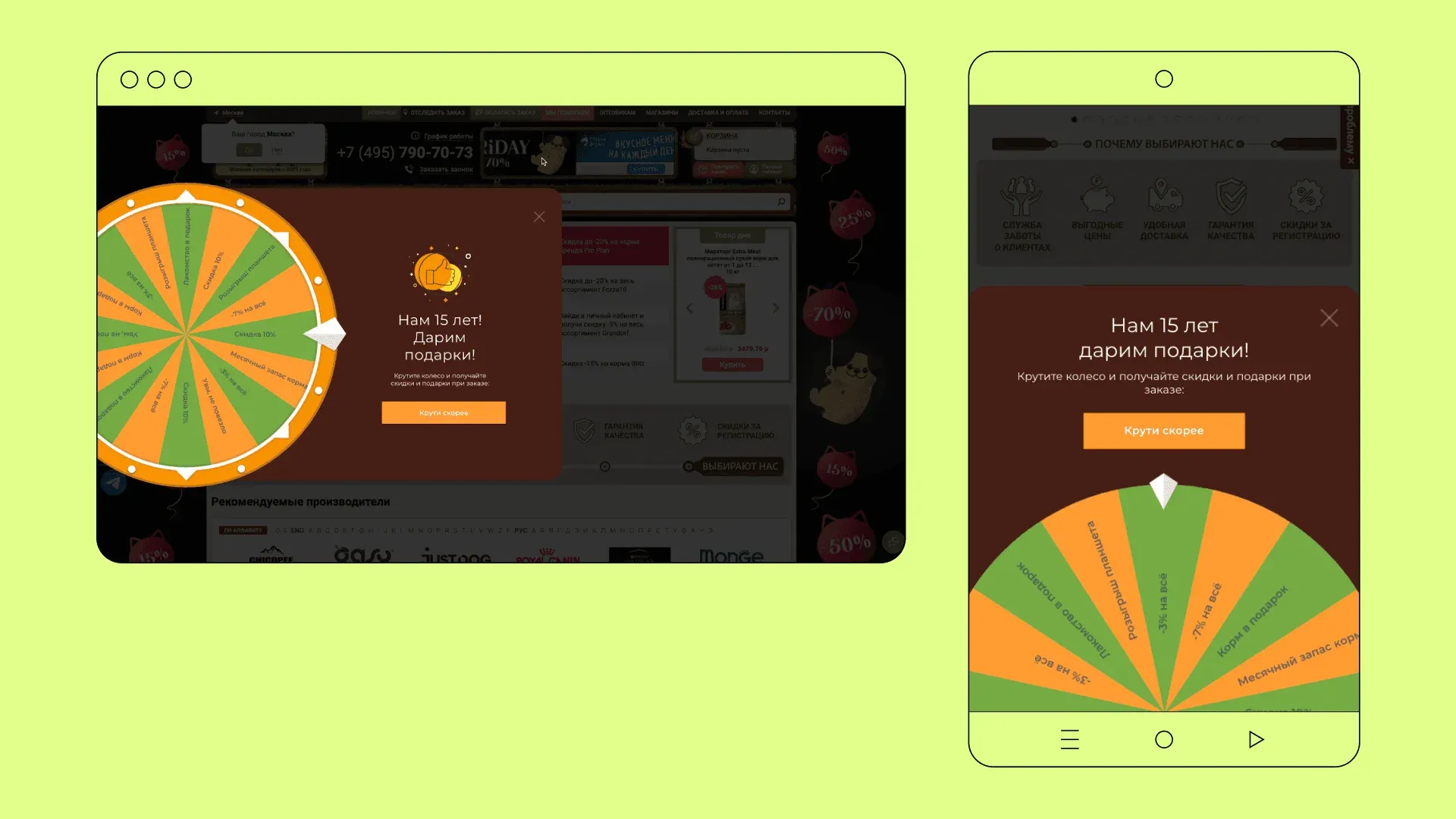 Мы предложили запустить колесо фортуны на сайте, где пользователи могли бы получать подарки вне зависимости от того, на какой сектор указала стрелка на барабане. Это беспроигрышная лотерея в красивой упаковке.