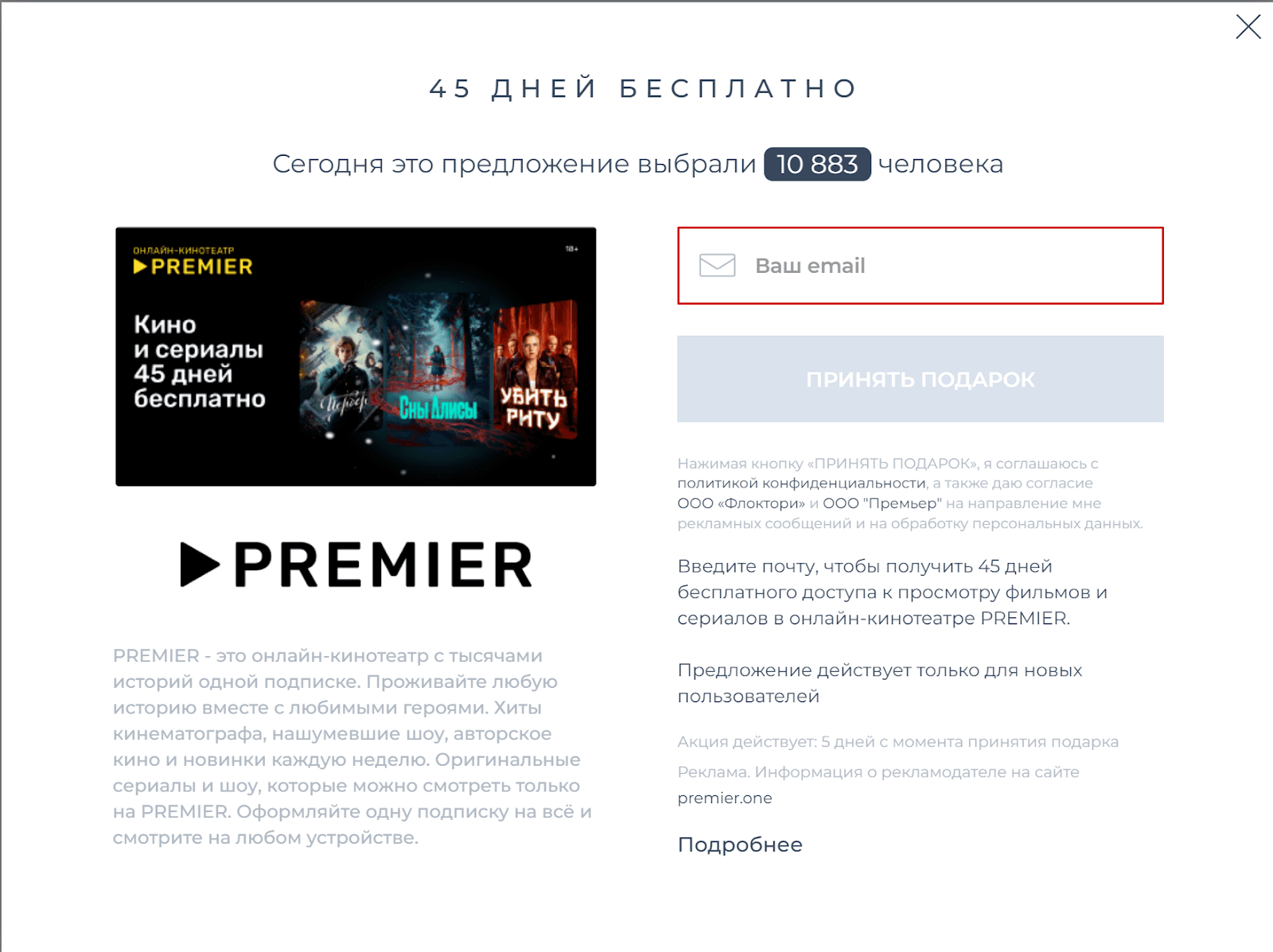 Оффер PREMIER появился на витрине Exchange с предложением 45 дней бесплатного использования видеосервиса. Такое предложение выбрали совместно команды Flocktory и PREMIER на старте сотрудничества. Воспользоваться предложением могли только новые пользователи.
