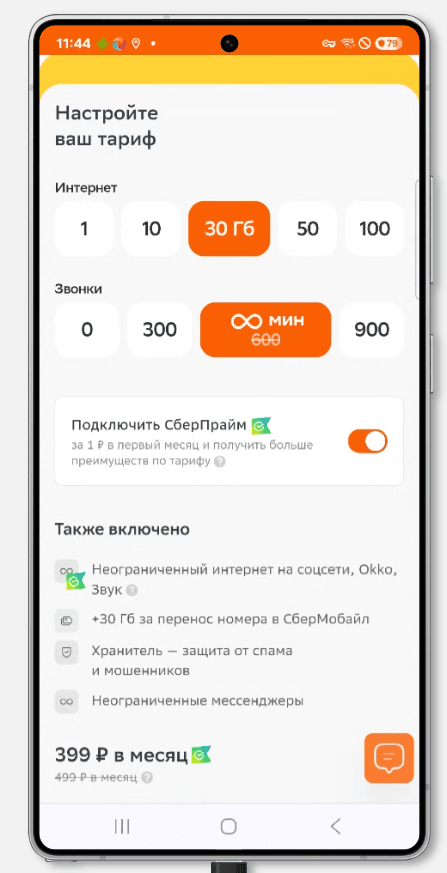 Когда пользователь попадает на главную страницу сайта СберМобайла, он видит калькулятор настройки тарифа.