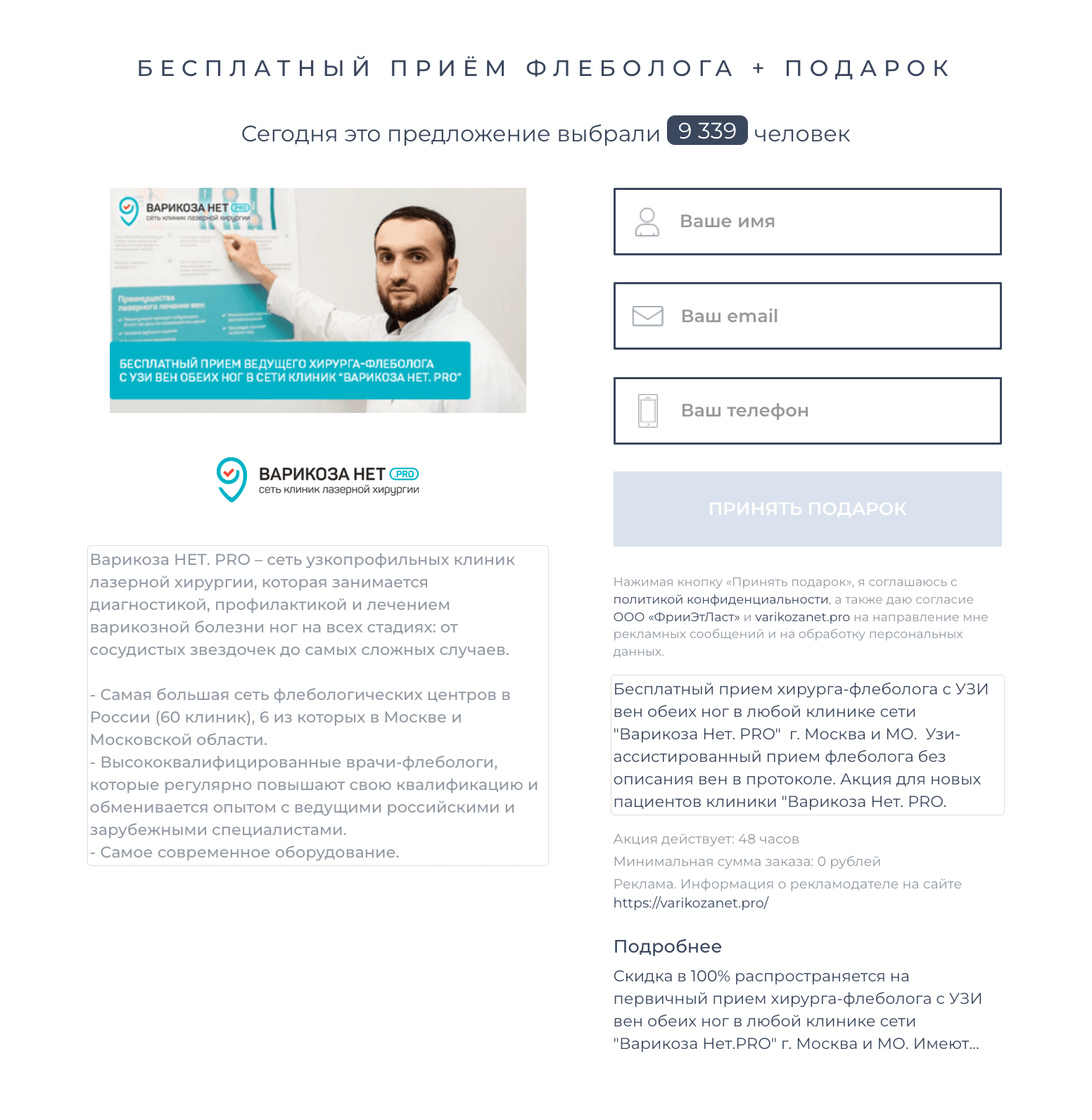 Первый запуск был с таким предложением. Подарок — УЗИ вен ног.