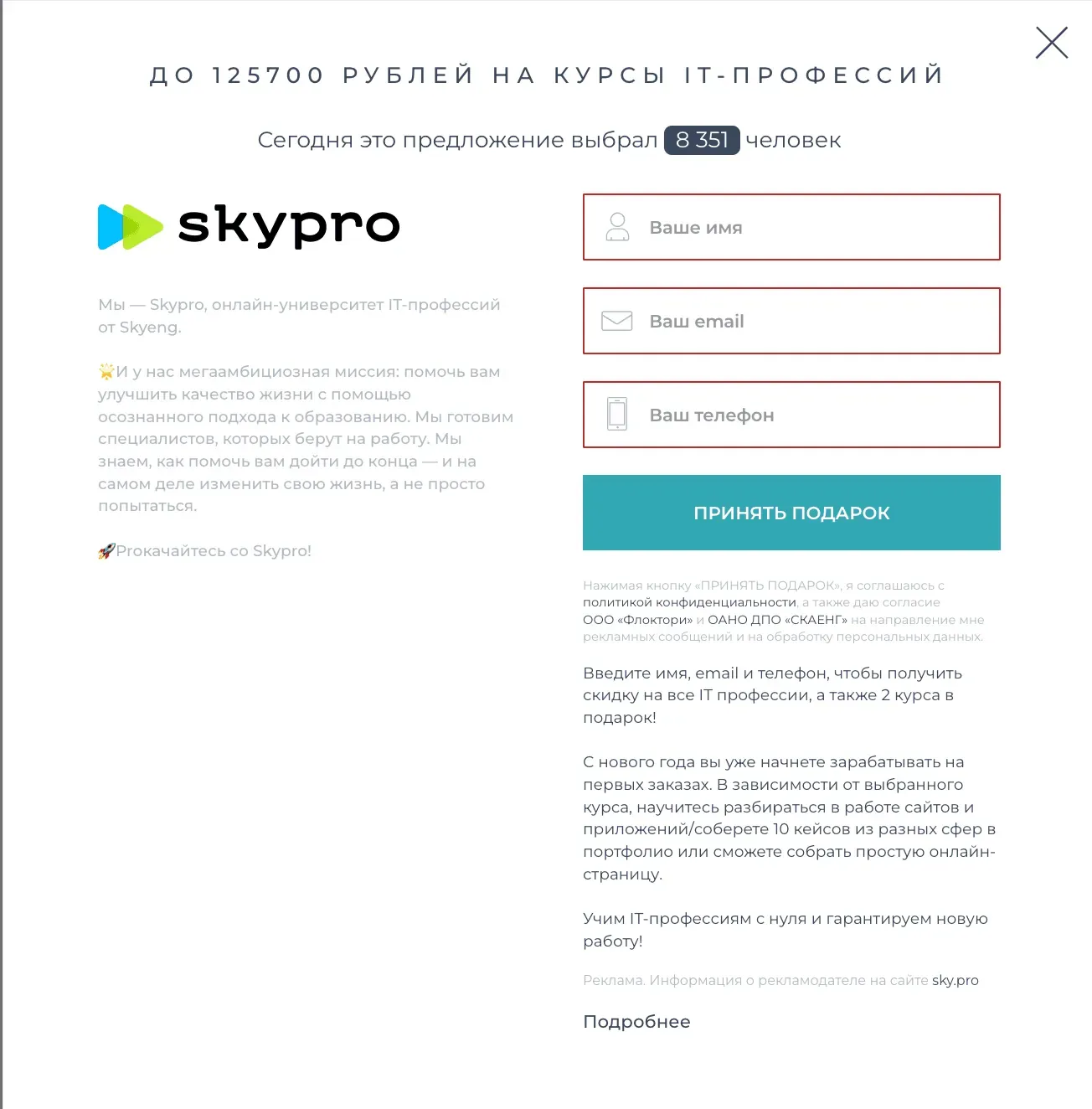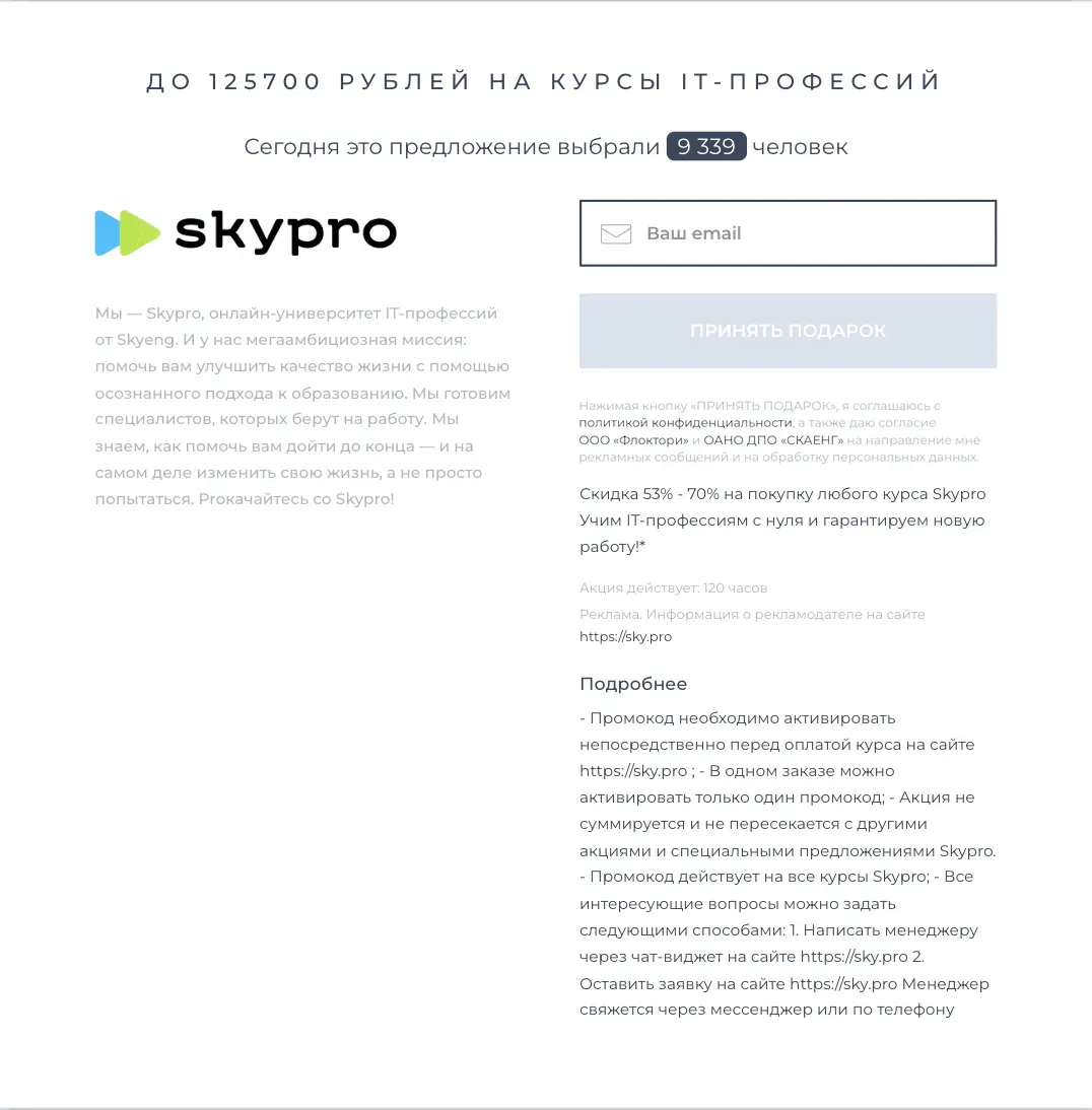 Кампания со стандартной воронкой. Пользователю нужно ввести email, а следующие действия он совершит уже на сайте партнера
