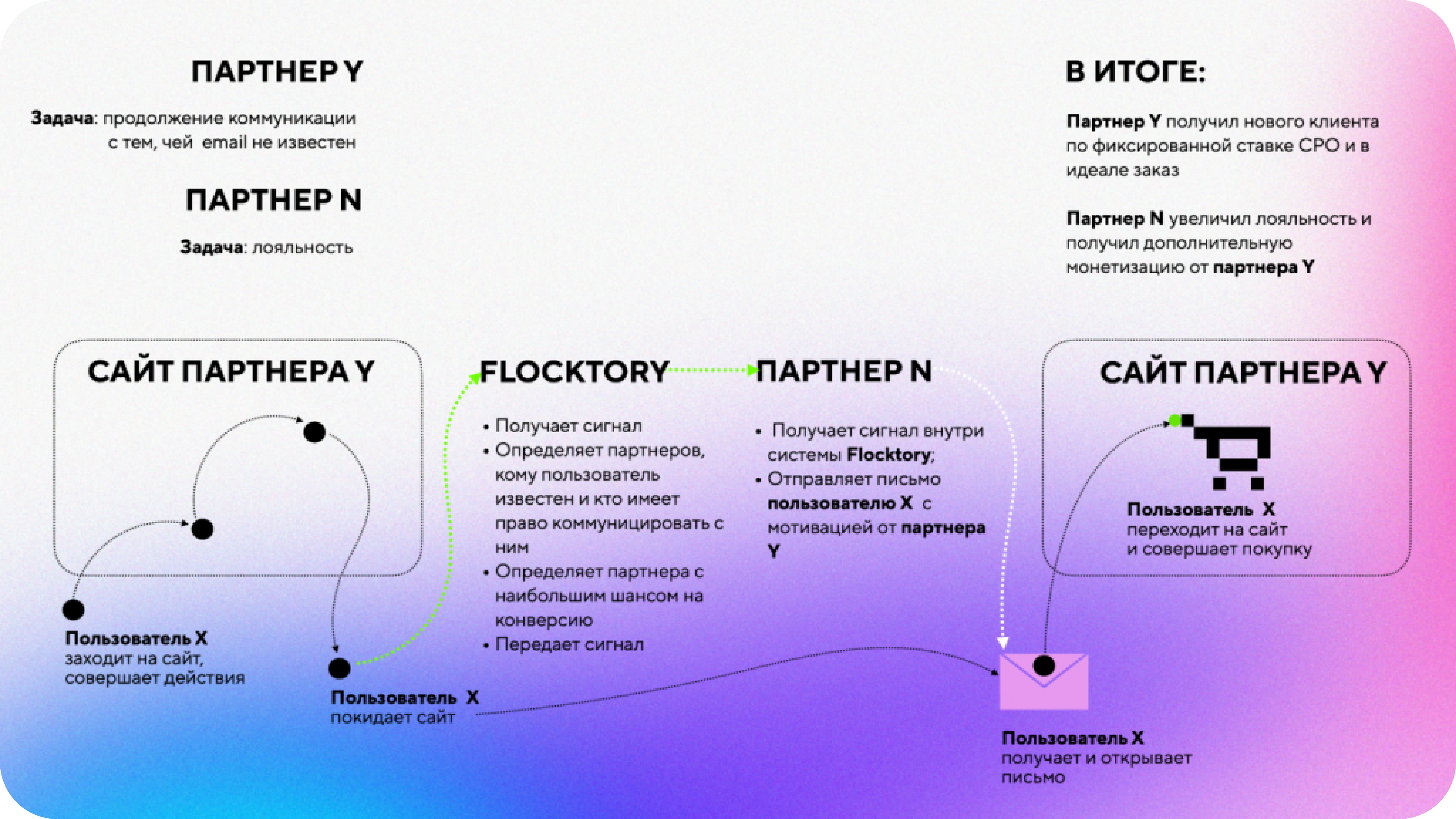Этот пользователь, скорее всего, будет известен ряду партнёров Flocktory (неконкурентов партнёру Y назовём партнёры N), которые смогут отправить ему email от своего имени с коммуникацией от партнёра Y.