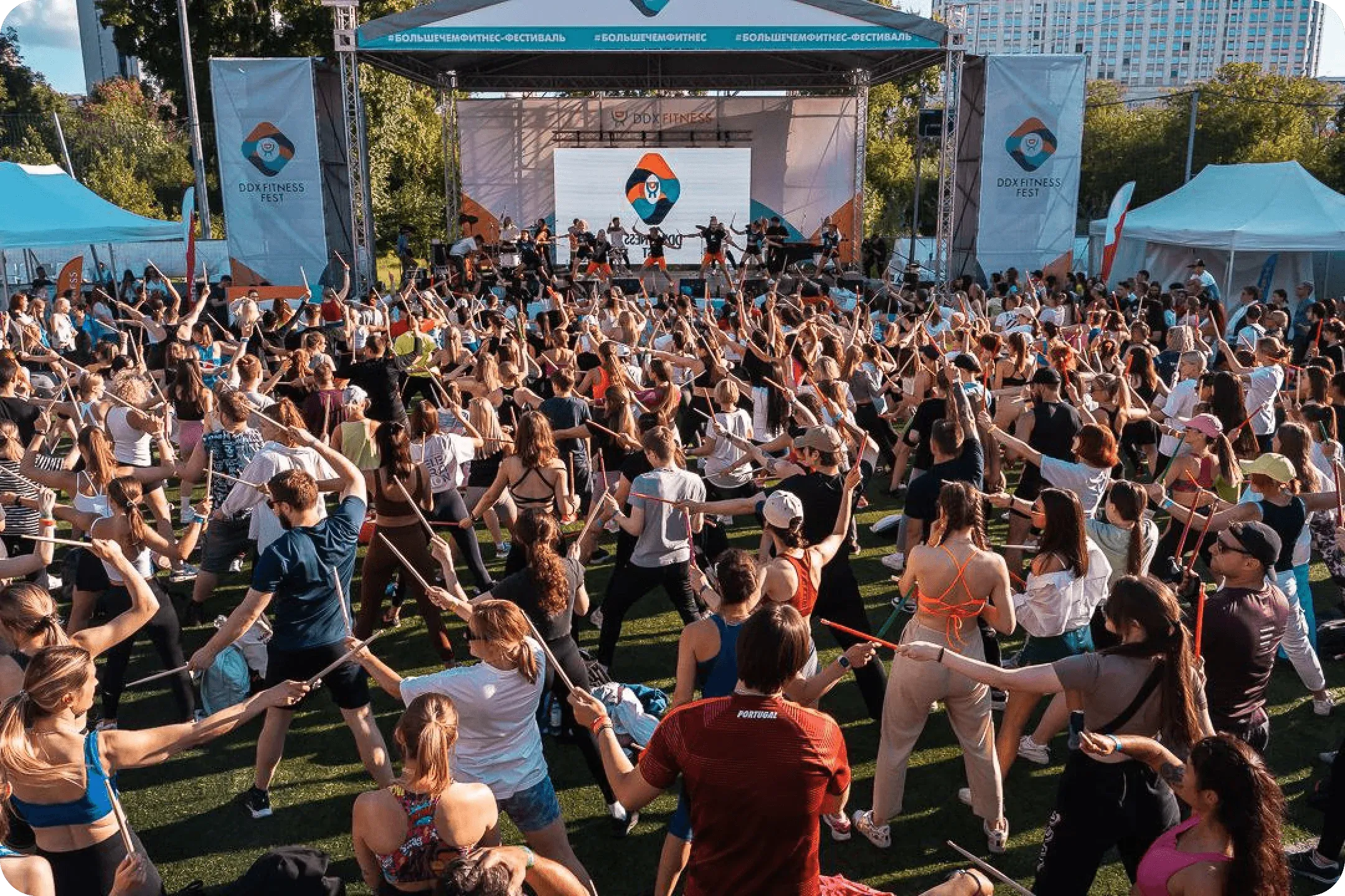 Кульминация наших ивентов — фитнес-фестиваль DDX Fitness FEST. Уже третий фестиваль прошел этим летом в Москве на территории музея-заповедника «Коломенское». Под открытым небом на площади 50 000 кв. метров был построен целый фитнес-город. Гостями фестиваля стали более 20 000 человек.