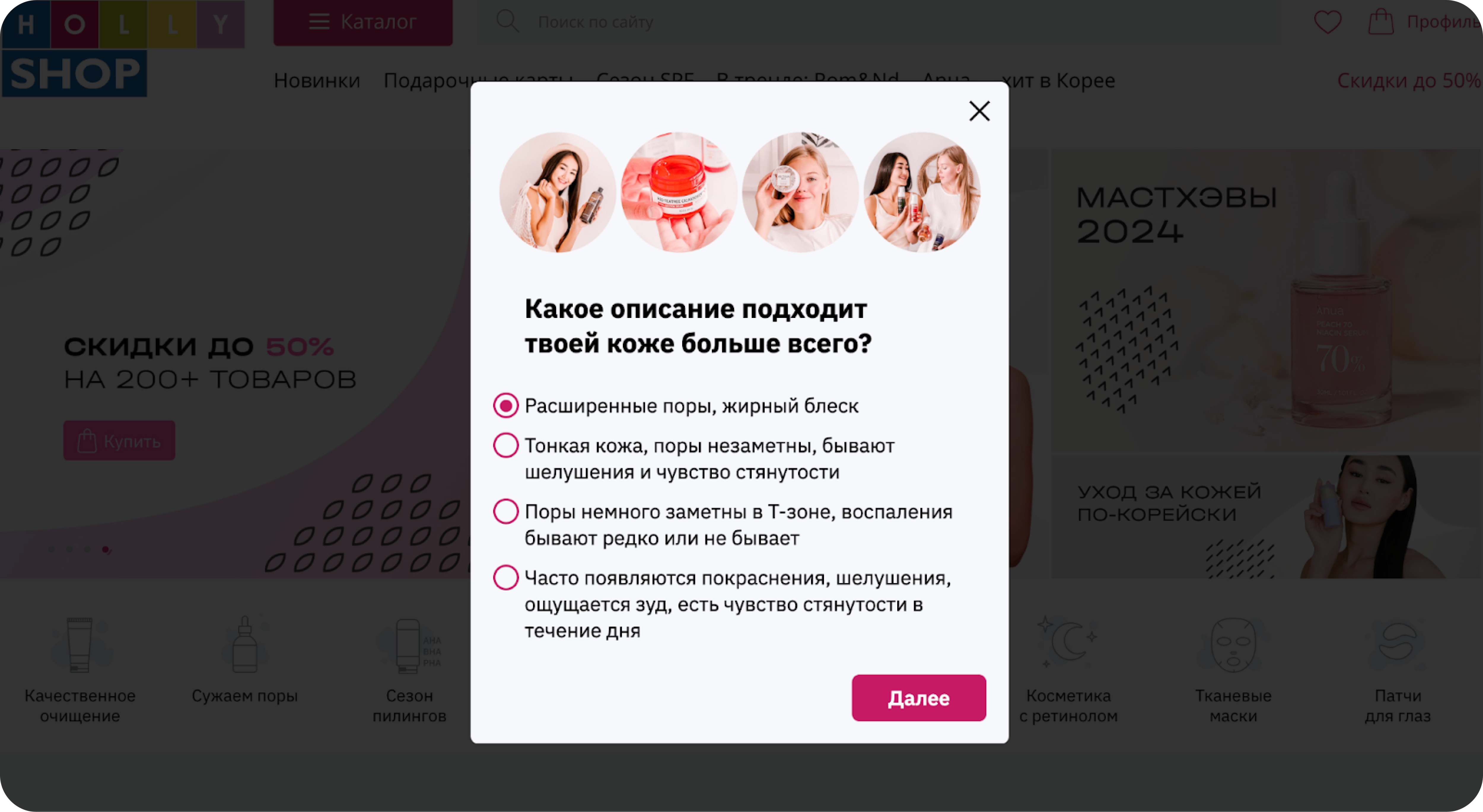 Кроме игры мы запустили многоступенчатый опрос о типе кожи пользователей. Каждый следующий вопрос был уточнением или дополнением предыдущего — так мы имитировали подход оффлайн-консультантов, которые помогают подбирать средства для ухода в магазинах.