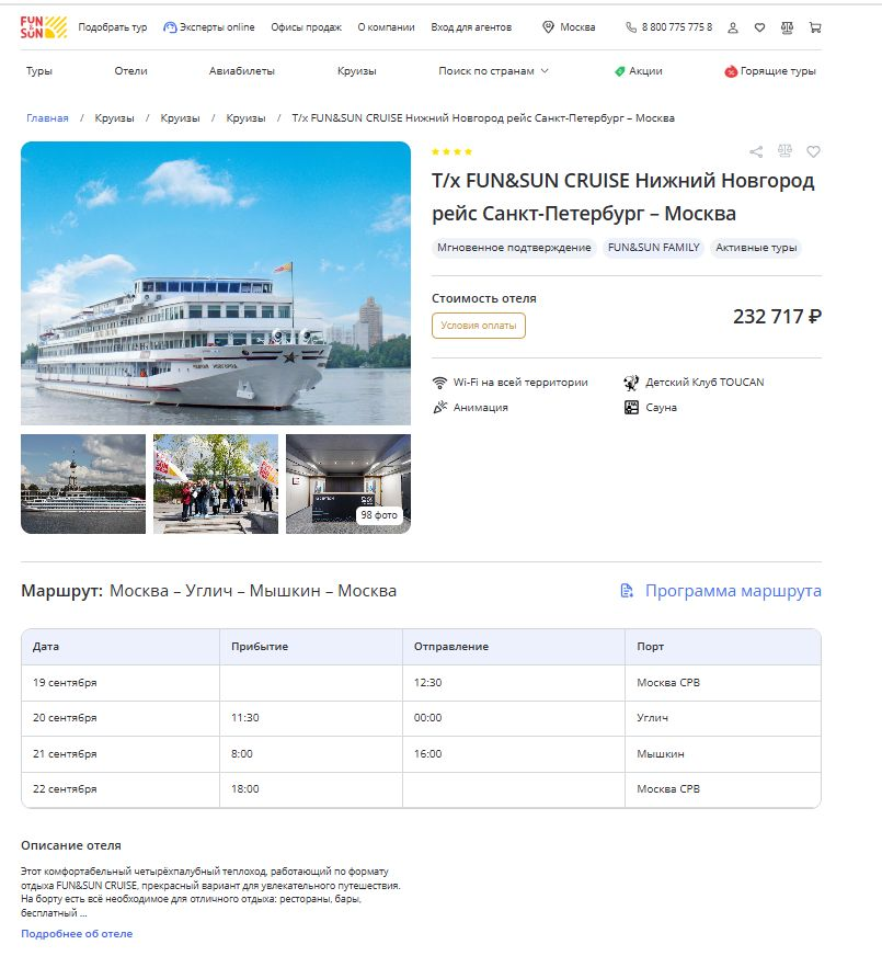 Размещение подробной программы упростило пользовательский путь — понятное описание круиза позволило посетителям сайта быстрее принимать решение о бронировании услуги.