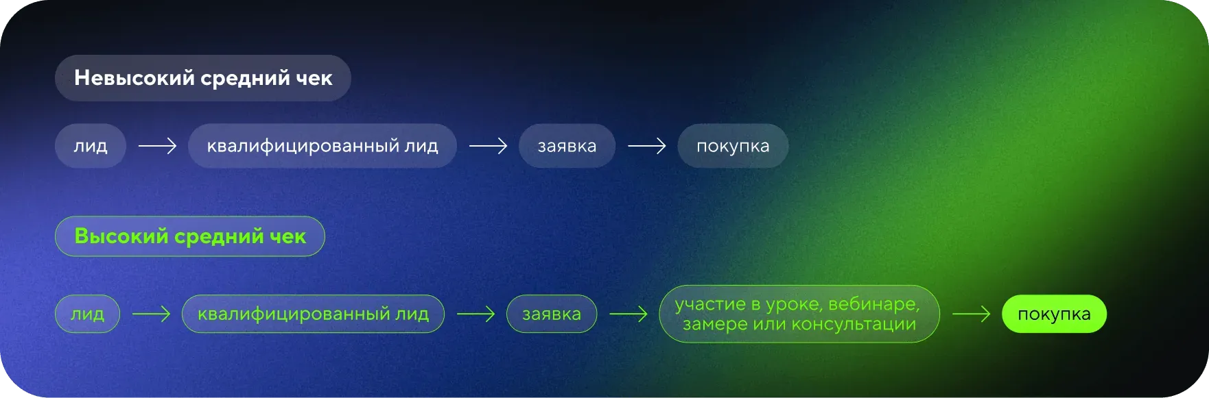 Путь клиента всегда построен по одной логике: он проходит от построения знания о продукте до совершения покупки и retention. Отличие можно увидеть в воронках продуктов с низким и высоким средним чеком.