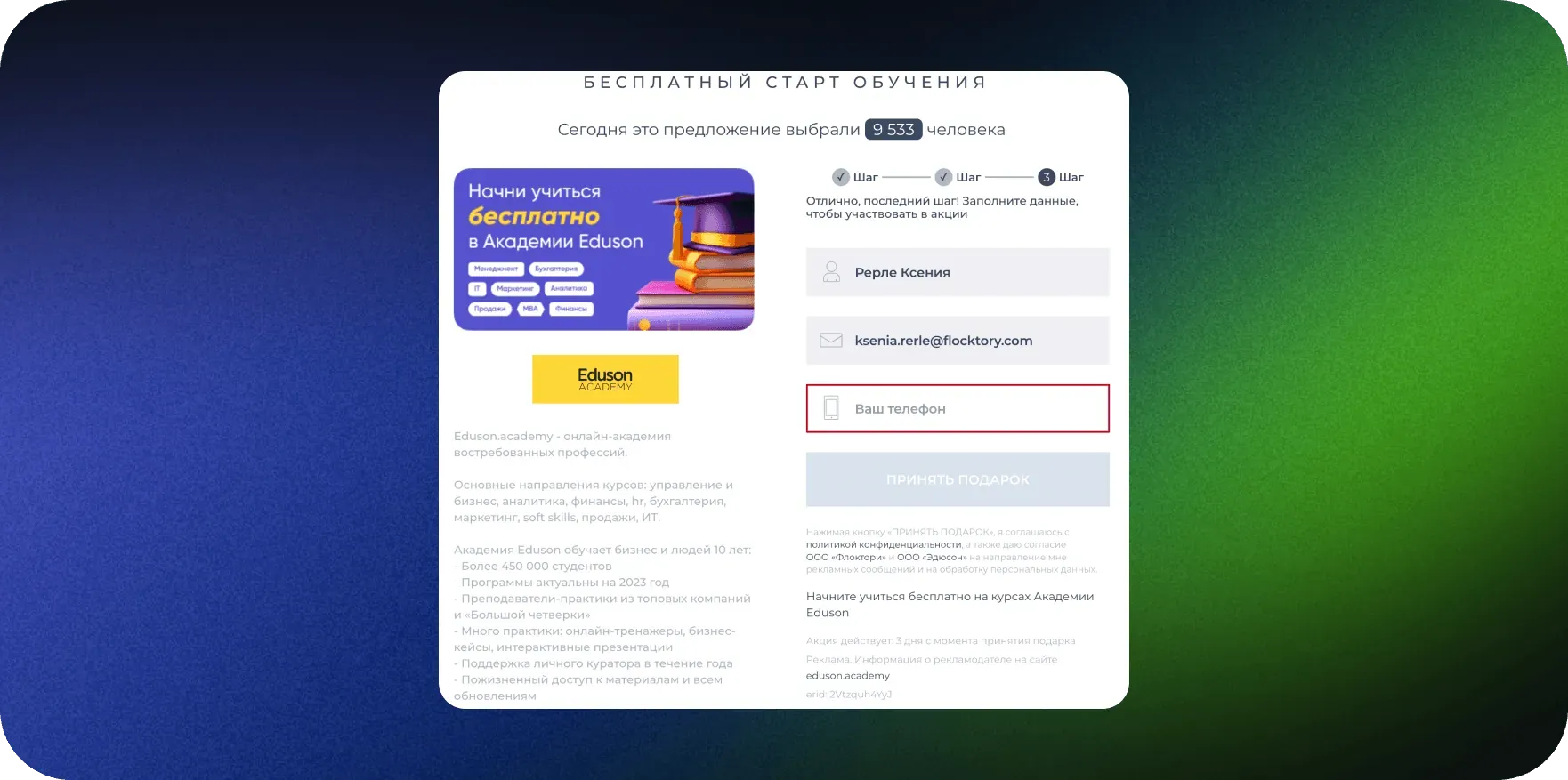 Сначала мы настроили стандартный сценарий лидогенерации: пользователь попадал на витрину, выбирал предложение Eduson среди прочих и вводил свой номер телефона. Академия Eduson оплачивала контакты, оставленные пользователями на витрине Exchange.