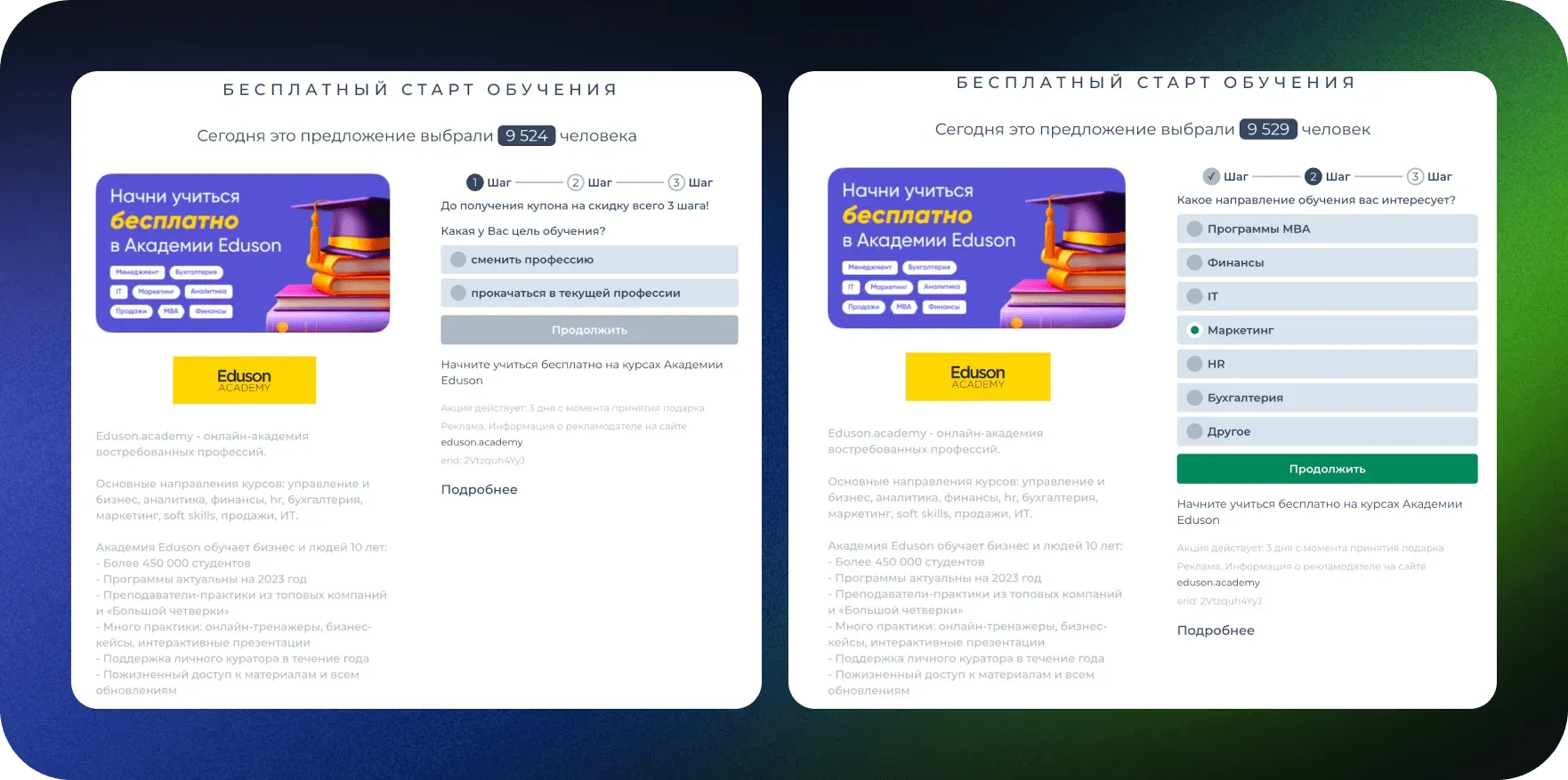 Вместо формы для сбора данных мы сделали квиз всего из двух вопросов: клиент выбирает цель и направление обучения. Квиз — одна из многих доступных на данном этапе механик. Мы часто перерабатываем продукт и находим более эффективные способы взаимодействия с аудиторией — stay tuned!