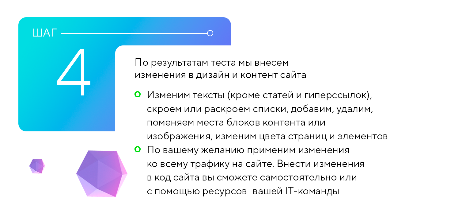 Мы помогаем команде быстрее проверять гипотезы, не вовлекая разработчиков в рутинные эксперименты. Результаты тестов позволяют быстро находить эффективные решения и внедрять их в продукт.