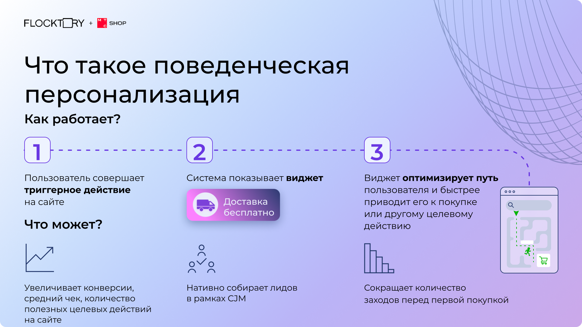 Вот еще один пример. На этапе корзины мы показываем пользователю акции и преимущества магазина. С помощью Flocktory мы настроили отдельный виджет, который предлагает пользователям связь в подарок за покупку. Размер подарка зависит от стоимости корзины пользователя. Динамический подарок значительно увеличил интерес к акции — наша гипотеза подтвердилась.Как работает персонализация сайта